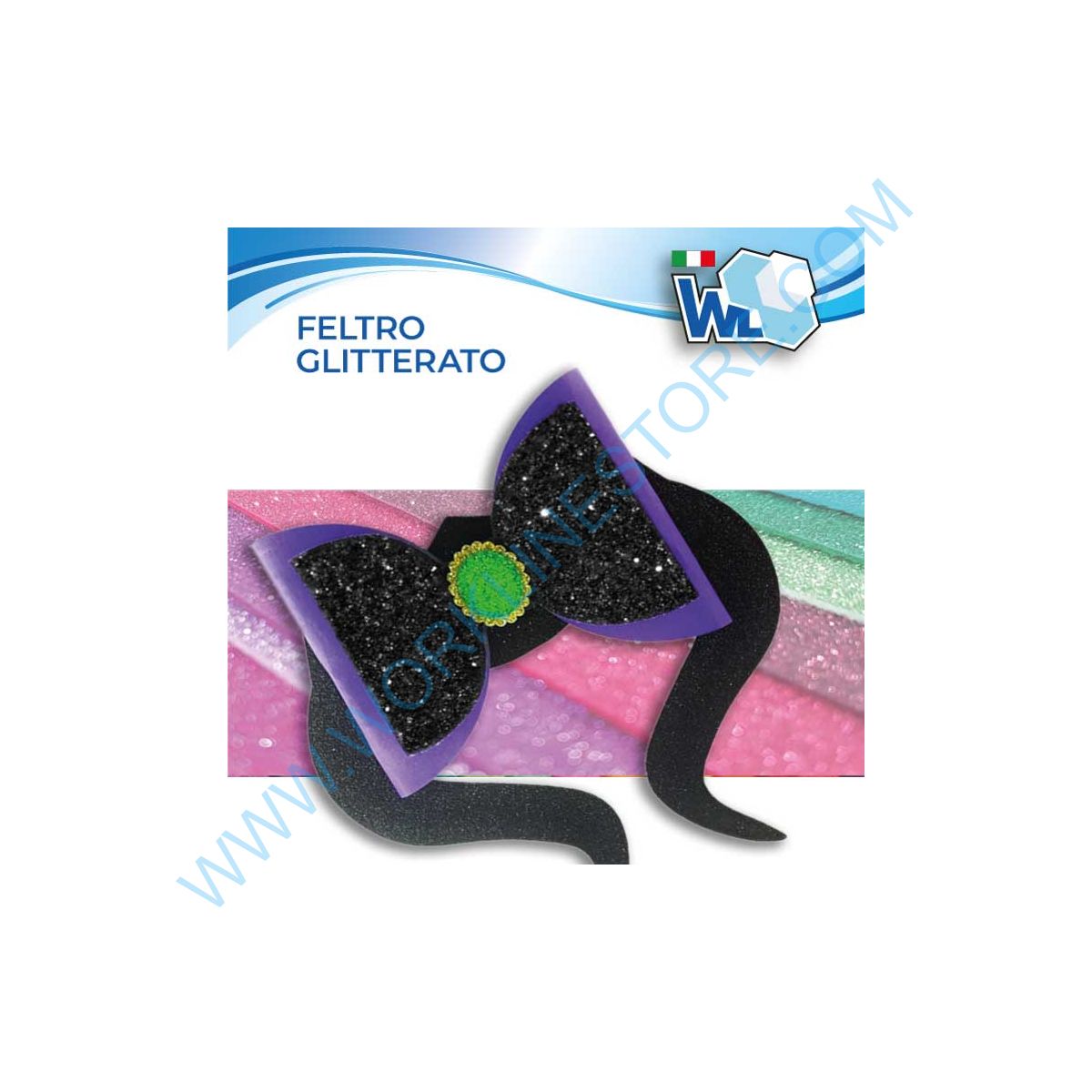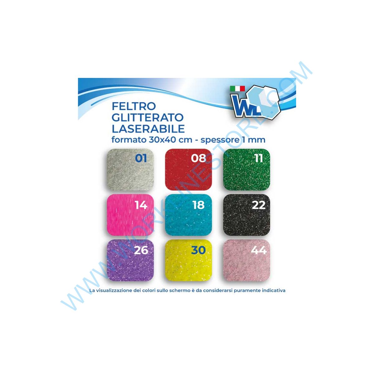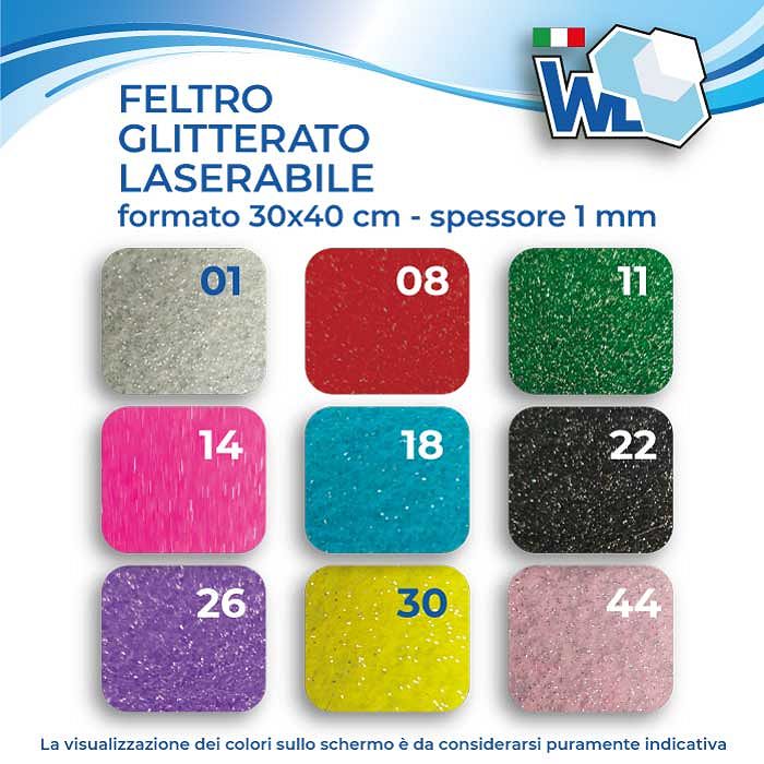 Feltro monocolore glitterato fine per decorazioni lavorabile a laser, disponibile in diversi colori, nelle misure di 300mm x 400mm x 1mm di spessore.