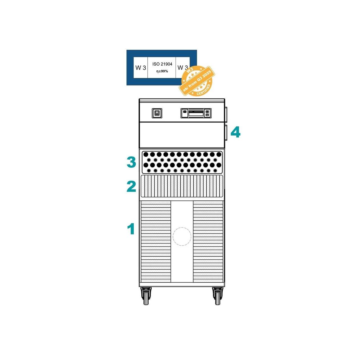 Il cambio filtri avviene comodamente tramite la porta anteriore dell’impianto. Il filtro SafeLine e il filtro antiparticolato sono due filtri separati, montati su un sistema di fissaggio comune, ma possono essere sostituiti indipendentemente, senza l’uso di utensili, in pochi minuti.