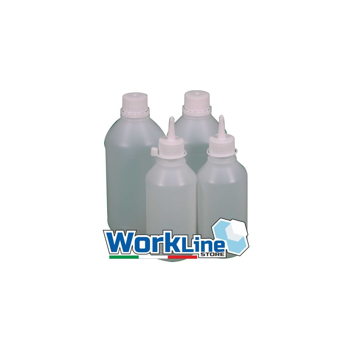 Flacone in plastica per inchiostri o liquidi Flacone in plastica bianca resistente per inchiostri o liquidi, con tappo di chiusura o erogatore, disponibile in versione da 1000ml, 500ml, 250ml.