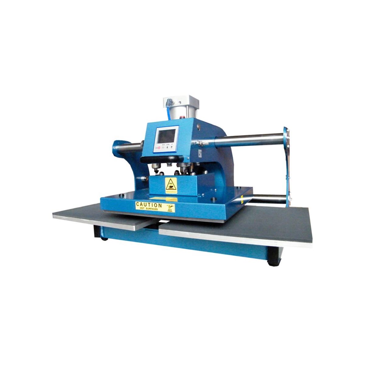 Questa termopressa unisce la potenza di pressione dell'aria compressa all'efficenza del doppio piatto. E' quindi possibile posizionare un capo da stampare mentre si sta pressando l'altro e ridurre i tempi morti.